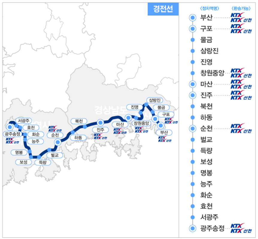 👉남도해양열차는 전라선과 경전선으로 구분됩니다. 아래의 이미지에서 각각의 노선과 주요정차역을 확인할 수 있습니다.