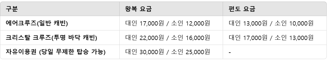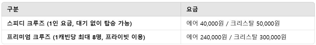 ⚠️ 스피디 크루즈는 대기 없이 바로 탑승 가능하며, 프리미엄 크루즈는 단독 캐빈 이용이 가능합니다.
