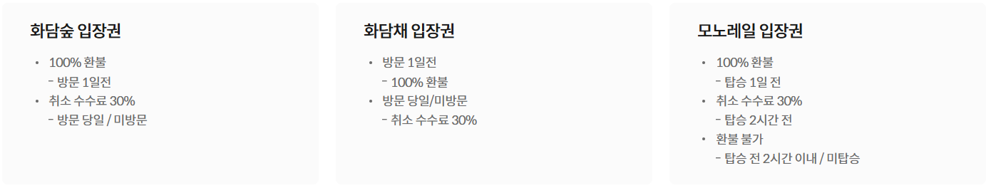 - 화담숲 입장권, 화담채 입장권, 모노레일 탑승권을 함께 예매한 경우, 입장권을 취소하면 함께 예매한 모노레일과 화담채도 함께 취소되니 주의바랍니다.